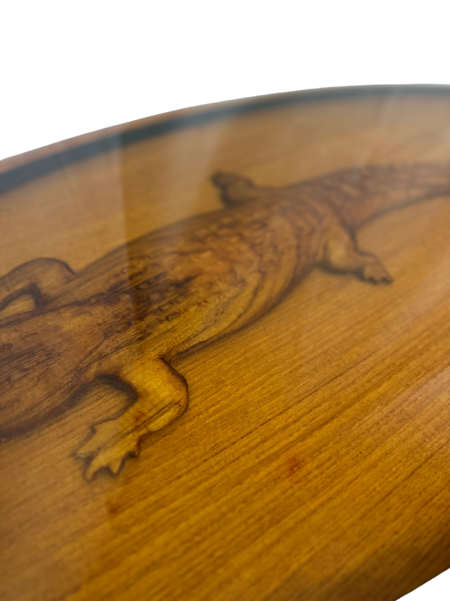 The defining feature of the Alligator Mirage table is a stunning 3D alligator encapsulated within its depth. This spectacular design element, crafted from the same rich teak wood, appears to be swimming within the clear, glass-like epoxy resin. The level of detail is incredible, from the scales on the alligator's back to the glint in its eye, evoking a sense of wonder and a touch of the wild right in your home.