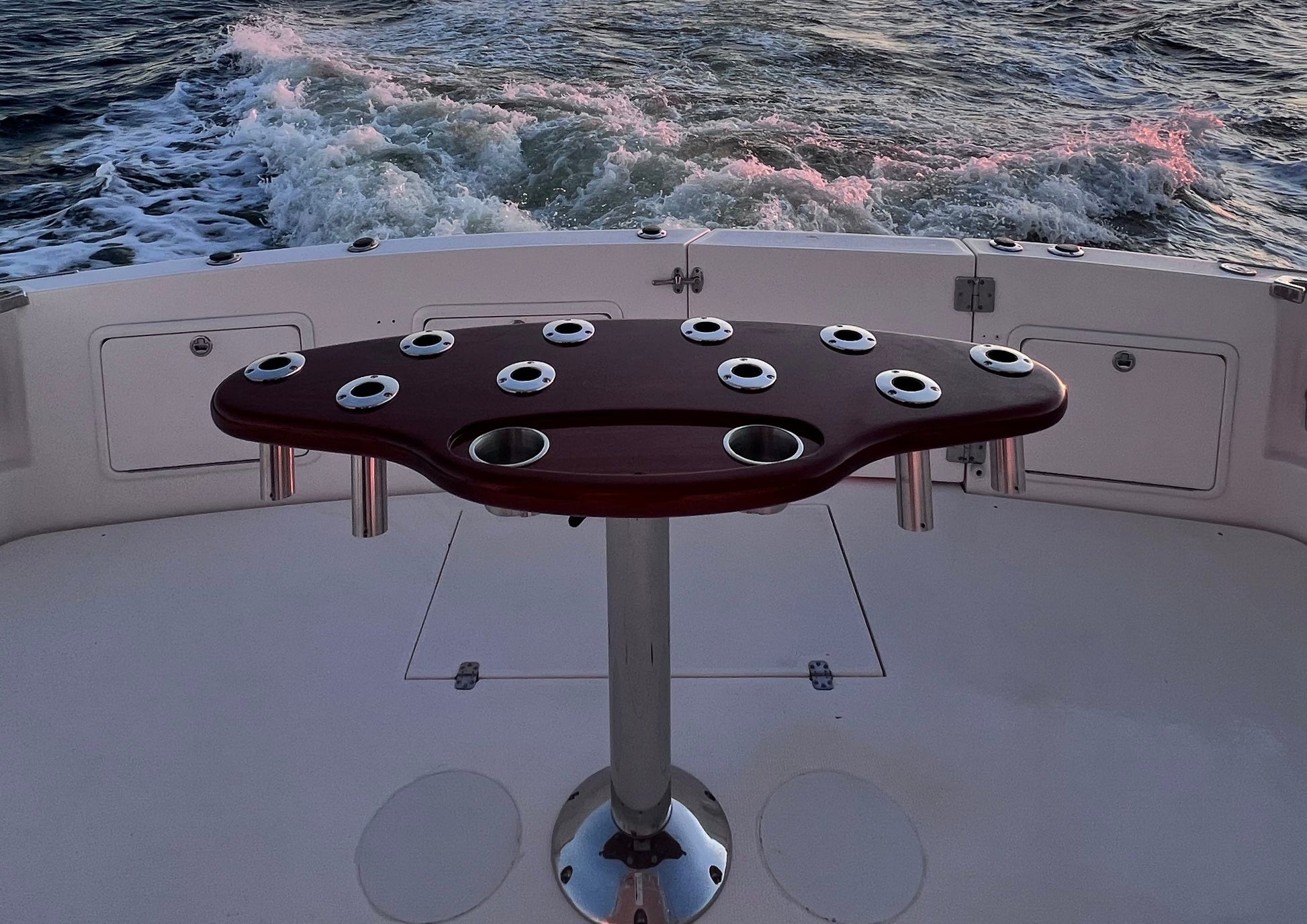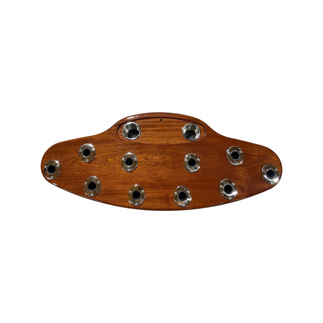 This is the larger of our rocket launcher designs, housing 10 rods and 2 cup holders. Hand made in St. Petersburg, FL from Sapele wood. These rocket launchers are built to last. Perfect for a large Sportfish or a commercial fishing boat.